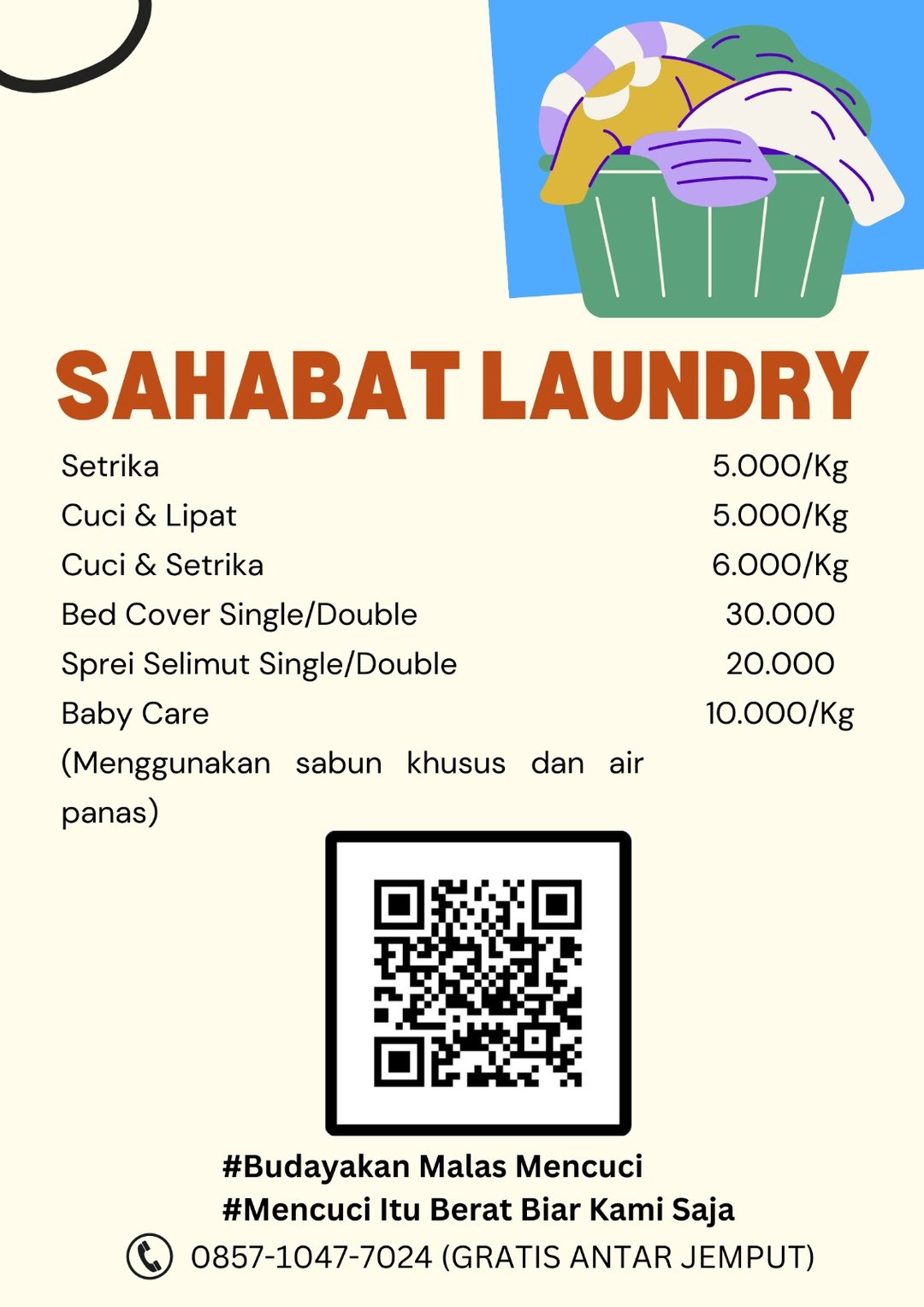 ✨ Sahabat Laundry Kelapa Dua Depok ✨ 🧺 Layanan laundry profesional & terpercaya untuk warga Depok! 🔥 Paket unggulan: Cuci setrika 8kg hanya Rp8.000/kg 🏷️ 1 hari selesai! ⏱️ Layanan express 🚚💨 Promo: Laundry 8kg, gratis 2kg tambahan! 🎉 Kami menyediakan: Cuci boneka, sprei, selimut, bed cover, dan korden jendela 🧸🛏️🪟 Layanan satuan atau kiloan sesuai kebutuhan Anda ⚖️ Juga tersedia: 1. Laundry kiloan 🧴 2. Cuci setrika 👕 3. Laundry express ⚡ 4. Antar jemput laundry 🚚 5. Cuci kering setrika 💦 Pilih Sahabat Laundry untuk hasil cemerlang, cepat, dan hemat! 🌟 📲 Hubungi kami sekarang dan nikmati layanan terbaik di Depok!